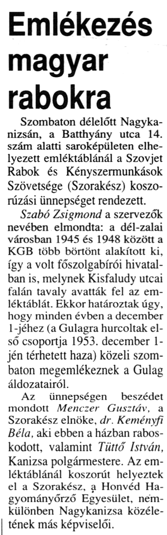 Nyilvános 1207 | 1870 | Zalai Hírlap 1997. december 1. 16. oldal | Emlékezés magyar rabokra Szombaton délelőtt Nagykanizsán, a Batthyány utca 14. szám alatti saroképületen elhelyezett emléktáblánál a Szovjet Rabok és Kényszermunkások Szövetsége (Szorakész) koszorúzási ünnepséget rendezett. Szabó Zsigmond a szervezők nevében elmondta: a dél-zalai városban 1945 és 1948 között a KGB több börtönt alakított ki, így a volt főszolgabírói hivatalban is, melynek Kisfaludy utcai falán tavaly avatták fel az emléktáblát. Ekkor határoztak úgy, hogy minden évben a december 1-jéhez (a Gulagra hurcoltak első csoportja 1953. december 1- jén térhetett haza) közeli szombaton megemlékeznek a Gulag áldozatairól. Az ünnepségen beszédet mondott Menczer Gusztáv, a Szorakész elnöke, dr. Keményfi Béla, aki ebben a házban raboskodott, valamint Tüttő István, Kanizsa polgármestere. Az emléktáblánál koszorút helyeztek el a Szorakész, a Honvéd Hagyományőrző Egyesület, nemkülönben Nagykanizsa közéletének más képviselői. |