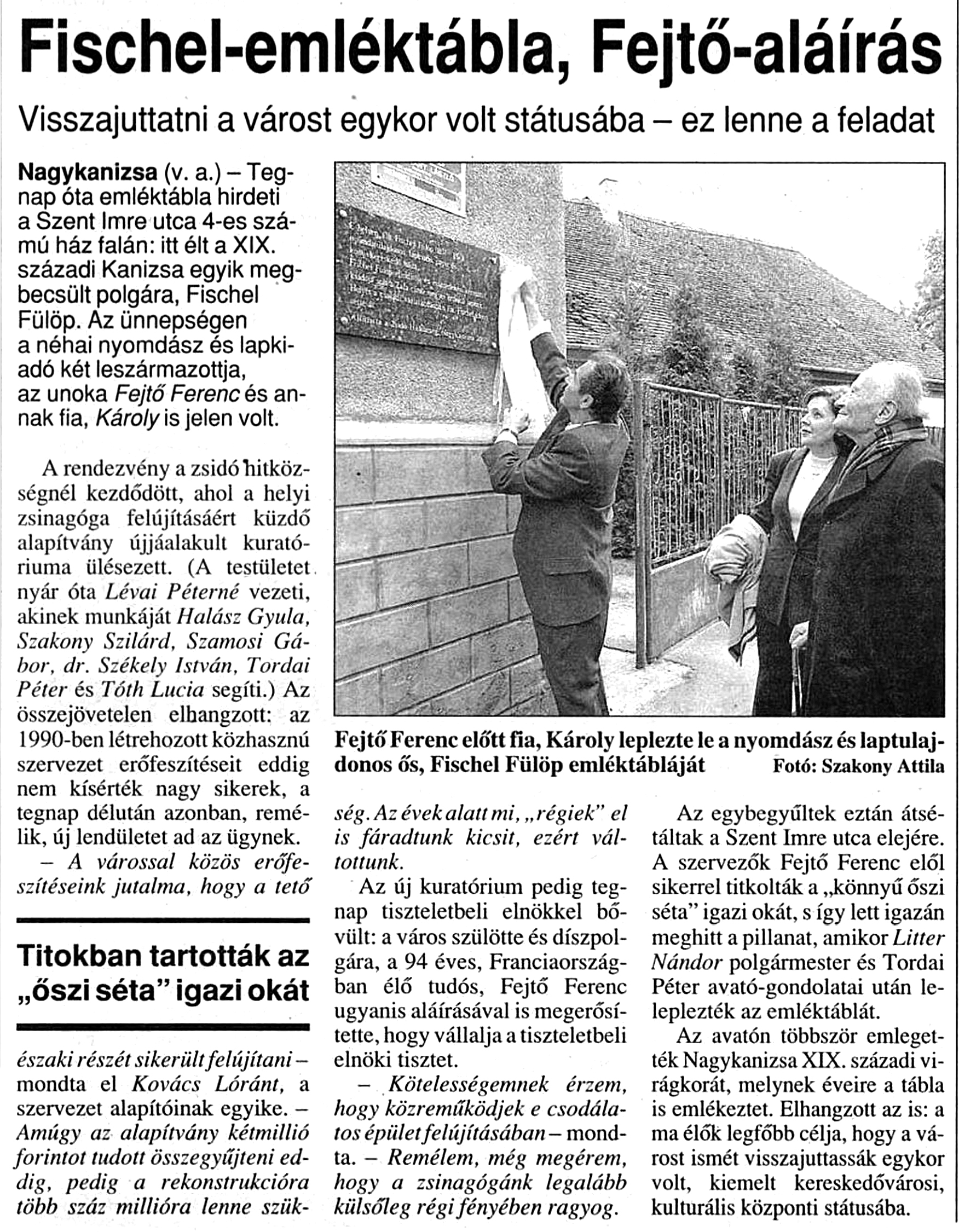 Nyilvános 1045 | 1504 | Zalai Hirlap 2003. október 14. 5. oldal | Fischel-emléktábla, Fejtő-aláírás Visszajuttatni a várost egykor volt státusába - ez lenne a feladat Nagykanizsa (v. a.) - Tegnap óta emléktábla hirdeti a Szent Imre utca 4-es számú ház falán: itt élt a XIX. századi Kanizsa egyik megbecsült polgára, Fischel Fülöp. Az ünnepségen a néhai nyomdász és lapkiadó két leszármazottja, az unoka Fejtő Ferenc és annak fia, Károly is jelen volt. A rendezvény a zsidó hitközségnél kezdődött, ahol a helyi zsinagóga felújításáért küzdő alapítvány újjáalakult kuratóriuma ülésezett. (A testületet nyár óta Lévai Péterné vezeti, akinek munkáját Halász Gyula, Szakony Szilárd, Szamosi Gábor, dr. Székely István, Tordai Péter és Tóth Lucia segíti.) Az összejövetelen elhangzott: az 1990-ben létrehozott közhasznú szervezet erőfeszítéseit eddig nem kísérték nagy sikerek, a tegnap délután azonban, remélik, új lendületet ad az ügynek. - A várossal közös erőfeszítéseink jutalma, hogy a tető északi részét sikerült felújítani - mondta el Kovács Lóránt, a szervezet alapítóinak egyike. - Amúgy az alapítvány kétmillió forintot tudott összegyűjteni eddig, pedig a rekonstrukcióra több száz millióra lenne szükség. Az évek alatt mi, „régiek” el is fáradtunk kicsit, ezért váltottunk. Az új kuratórium pedig tegnap tiszteletbeli elnökkel bővült: a város szülötte és díszpolgára, a 94 éves, Franciaországban élő tudós, Fejtő Ferenc ugyanis aláírásával is megerősítette, hogy vállalja a tiszteletbeli elnöki tisztet. - Kötelességemnek érzem, hogy közreműködjek e csodálatos épület felújításában - mondta. - Remélem, még megérem, hogy a zsinagógánk legalább külsőleg régi fényében ragyog. Az egybegyűltek eztán átsétáltak a Szent Imre utca elejére. A szervezők Fejtő Ferenc elől sikerrel titkolták a„könnyű őszi séta” igazi okát, s így lett igazán meghitt a pillanat, amikor Litter Nándor polgármester és Tordai Péter avató-gondolatai után leleplezték az emléktáblát. Az avatón többször emlegették Nagykanizsa XIX. századi virágkorát, melynek éveire a tábla is emlékeztet. Elhangzott az is: a ma élők legfőbb célja, hogy a várost ismét visszajuttassák egykor volt, kiemelt kereskedővárosi, kulturális központi státusába. Fejtő Ferenc előtt fia, Károly leplezte le a nyomdász és laptulajdonos ős, Fischel Fülöp emléktábláját Fotó: Szakony Attila |
