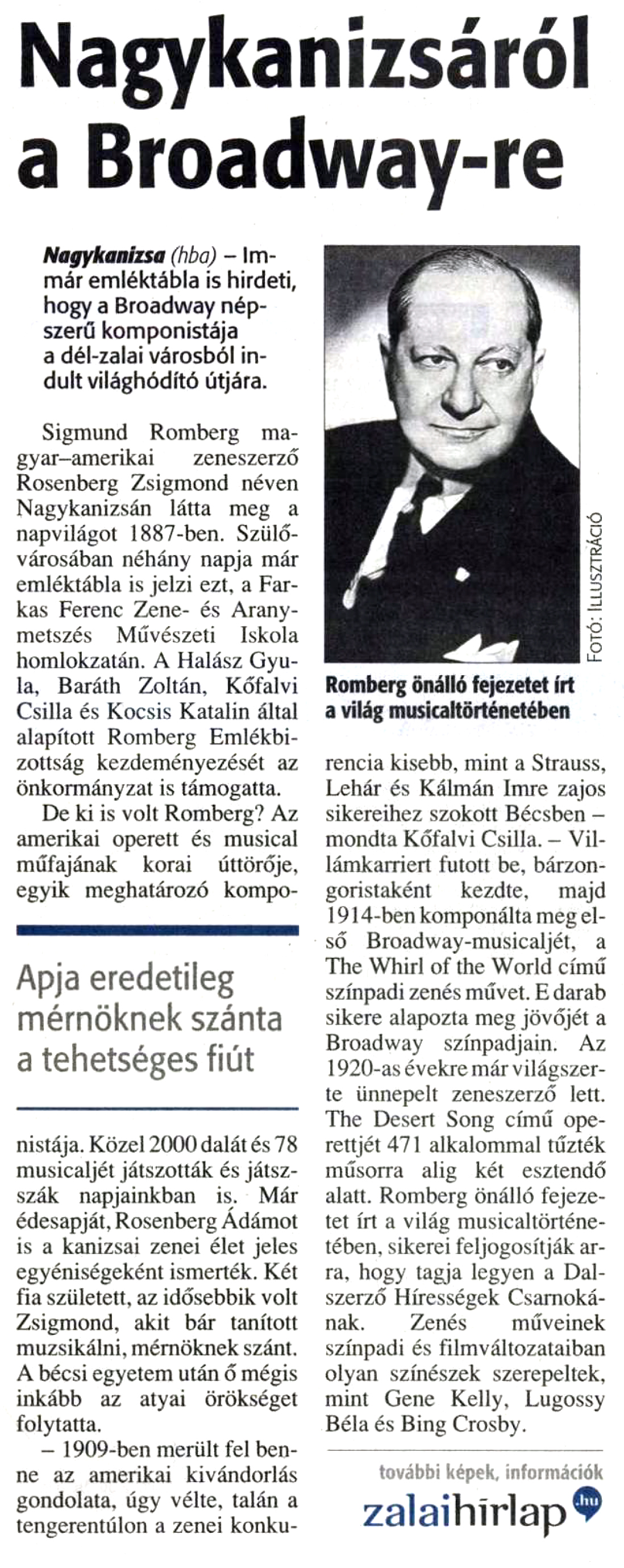 Nyilvános 945 | 1089 | Zalai Hírlap 2010. október 1. 7. oldal | Nagykanizsáról a Broadway-re Nagykanizsa (hba) - Immár emléktábla is hirdeti, hogy a Broadway népszerű komponistája a dél-zalai városból indult világhódító útjára. Sigmund Romberg magyar-amerikai zeneszerző Rosenberg Zsigmond néven Nagykanizsán látta meg a napvilágot 1887-ben. Szülővárosában néhány napja már emléktábla is jelzi ezt, a Farkas Ferenc Zene- és Aranymetszés Művészeti Iskola homlokzatán. A Halász Gyula, Baráth Zoltán, Kőfalvi Csilla és Kocsis Katalin által alapított Romberg Emlékbizottság kezdeményezését az önkormányzat is támogatta. De ki is volt Romberg? Az amerikai operett és musical műfajának korai úttörője, egyik meghatározó komponistája. Közel 2000 dalát és 78 musicaljét játszották és játsszák napjainkban is. Már édesapját, Rosenberg Ádámot is a kanizsai zenei élet jeles egyéniségeként ismerték. Két fia született, az idősebbik volt Zsigmond, akit bár tanított muzsikálni, mérnöknek szánt. A bécsi egyetem után ő mégis inkább az atyai örökséget folytatta. - 1909-ben merült fel benne az amerikai kivándorlás gondolata, úgy vélte, talán a tengerentúlon a zenei konkurencia kisebb, mint a Strauss, Lehár és Kálmán Imre zajos sikereihez szokott Bécsben - mondta Kőfalvi Csilla. - Villámkarriert futott be, bárzongoristaként kezdte, majd 1914-ben komponálta meg első Broadway-musicaljét, a The Whirl of the World című színpadi zenés művet. E darab sikere alapozta meg jövőjét a Broadway színpadjain. Az 1920-as évekre már világszerte ünnepelt zeneszerző lett. The Desert Song című operettjét 471 alkalommal tűzték műsorra alig két esztendő alatt. Romberg önálló fejezetet írt a világ musicaltörténetében, sikerei feljogosítják arra, hogy tagja legyen a Dalszerző Hírességek Csarnokának. Zenés műveinek színpadi és filmváltozataiban olyan színészek szerepeltek, mint Gene Kelly, Lugossy Béla és Bing Crosby. Romberg önálló fejezetet írt a világ musicaltörténetében |