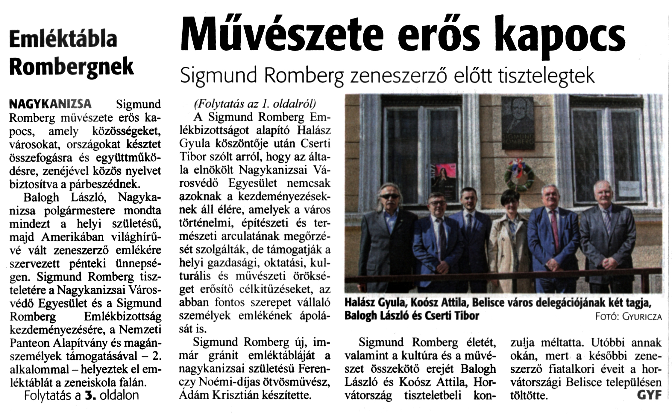 Nyilvános 962 | 1291 | Zalai Hírlap 2023. március 25. 1, 3. oldal | Emléktábla Rombergnek NAGYKANIZSA Sigmund Romberg művészete erős kapocs, amely közösségeket, városokat, országokat késztet összefogásra és együttműködésre, zenéjével közös nyelvet biztosítva a párbeszédnek. Balogh László, Nagykanizsa polgármestere mondta mindezt a helyi születésű, majd Amerikában világhírűvé vált zeneszerző emlékére szervezett pénteki ünnepségen. Sigmund Romberg tiszteletére a Nagykanizsai Városvédő Egyesület és a Sigmund Romberg Emlékbizottság kezdeményezésére, a Nemzeti Panteon Alapítvány és magánszemélyek támogatásával - 2. alkalommal - helyeztek el emléktáblát a zeneiskola falán. A Sigmund Romberg Emlékbizottságot alapító Halász Gyula köszöntője után Cserti Tibor szólt arról, hogy az általa elnökölt Nagykanizsai Városvédő Egyesület nemcsak azoknak a kezdeményezéseknek áll élére, amelyek a város történelmi, építészeti és természeti arculatának megőrzését szolgálták, de támogatják a helyi gazdasági, oktatási, kulturális és művészeti örökséget erősítő célkitűzéseket, az abban fontos szerepet vállaló személyek emlékének ápolását is. Sigmund Romberg új, immár gránit emléktábláját a nagykanizsai születésű Ferenczy Noémi-díjas ötvösművész, Ádám Krisztián készítette. Sigmund Romberg életét, valamint a kultúra és a művészet összekötő erejét Balogh László és Koósz Attila, Horvátország tiszteletbeli kon- zulja méltatta. Utóbbi annak okán, mert a későbbi zeneszerző fiatalkori éveit a horvátországi Belisce településen töltötte. CYF Halász Gyula, Koósz Attila, Belisce város delegációjának két tagja, Balogh László és Cserti Tibor Fotó: Gyuricza |