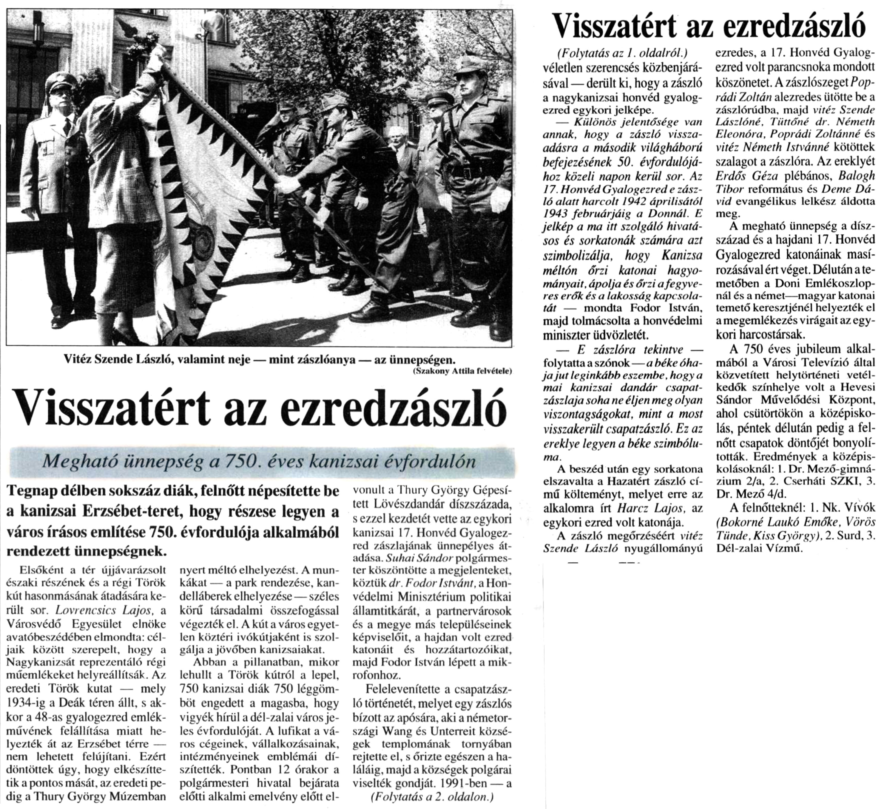 Nyilvános 1162 | 1818 | Zalai Hírlap 1995. április 22. 94. szám 1, 2. oldal | Visszatért az ezredzászló Megható ünnepség a 750. éves kanizsai évfordulón Vitéz Szende László, valamint neje — mint zászlóanya — az ünnepségen. (Szakony Attila felvétele) Tegnap délben sokszáz diák, felnőtt népesítette be a kanizsai Erzsébet-teret, hogy részese legyen a város írásos említése 750. évfordulója alkalmából rendezett ünnepségnek. Elsőként a tér újjávarázsolt északi részének és a régi Török kút hasonmásának átadására került sor. Lovrencsics Lajos, a Városvédő Egyesület elnöke avatóbeszédében elmondta: céljaik között szerepelt, hogy a Nagykanizsát reprezentáló régi műemlékeket helyreállítsák. Az eredeti Török kutat — mely 1934-ig a Deák téren állt, s akkor a 48-as gyalogezred emlékművének felállítása miatt helyezték át az Erzsébet térre — nem lehetett felújítani. Ezért döntöttek úgy, hogy elkészíttetik a pontos mását, az eredeti pedig a Thury György Múzemban nyert méltó elhelyezést. A munkákat — a park rendezése, kandeláberek elhelyezése—széles körű társadalmi összefogással végezték el. A kút a város egyetlen köztéri ivókútjaként is szolgálja a jövőben kanizsaiakat. Abban a pillanatban, mikor lehullt a Török kútról a lepel, 750 kanizsai diák 750 léggömböt engedett a magasba, hogy vigyék hírül a dél-zalai város jeles évfordulóját. A lufikat a város cégeinek, vállalkozásainak, intézményeinek emblémái díszítették. Pontban 12 órakor a polgármesteri hivatal bejárata előtti alkalmi emelvény előtt elvonult a Thury György Gépesített Lövészdandár díszszázada, s ezzel kezdetét vette az egykori kanizsai 17. Honvéd Gyalogezred zászlajának ünnepélyes átadása. Suhai Sándor polgármester köszöntötte a megjelenteket, köztük dr. Fodor Istvánt, a Honvédelmi Minisztérium politikai államtitkárát, a partnervárosok és a megye más településeinek képviselőit, a hajdan volt ezred katonáit és hozzátartozóikat, majd Fodor István lépett a mikrofonhoz. Felelevenítette a csapatzászló történetét, melyet egy zászlós bízott az apósára, aki a németországi Wang és Unterreit községek templomának tornyában rejtette el, s őrizte egészen a haláláig, majd a községek polgárai viselték gondját. 1991-ben — a (Folytatás a 2. oldalon.) Visszatért az ezredzászló (Folytatás az 1. oldalról.) véletlen szerencsés közbenjárásával — derült ki, hogy a zászló a nagykanizsai honvéd gyalogezred egykori jelképe. — Különös jelentősége van annak, hogy a zászló visszaadásra a második világháború befejezésének 50. évfordulójához közeli napon kerül sor. Az 17. Honvéd Gyalogezred e zászló alatt harcolt 1942 áprilisától 1943 februárjáig a Donnál. E jelkép a ma itt szolgáló hivatásos és sorkatonák számára azt szimbolizálja, hogy Kanizsa méltón őrzi katonai hagyományait. ápolja és őrzi a fegyveres ereik és a lakosság kapcsolatát — mondta Fodor István, majd tolmácsolta a honvédelmi miniszter üdvözletét. — E zászlóra tekintve — folytatta a szónok — a béke óhaja jut leginkább eszembe, hogy a mai kanizsai dandár csapatzászlaja soha ne éljen meg olyan viszontagságokat, mint a most visszakerült csapatzászló. Ez az ereklye legyen a béke szimbóluma. A beszéd után egy sorkatona elszavalta a Hazatért zászló című költeményt, melyet erre az alkalomra írt Harcz Lajos, az egykori ezred volt katonája. A zászló megőrzéséért vitéz Szende László nyugállományú ezredes, a 17. Honvéd Gyalogezred volt parancsnoka mondott köszönetét. A zászlószeget Poprádi Zoltán alezredes ütötte be a zászlórúdba, majd vitéz Szende Lászlóné, Tüttőné dr. Németh Eleonóra, Poprádi Zoltánné és vitéz Németh Istvánné kötöttek szalagot a zászlóra. Az ereklyét Erdős Géza plébános, Balogh Tibor református és Deme Dávid evangélikus lelkész áldotta meg. A megható ünnepség a díszszázad és a hajdani 17. Honvéd Gyalogezred katonáinak masírozásával ért véget. Délután a temetőben a Doni Emlékoszlopnál és a német—magyar katonai temető keresztjénél helyezték el a megemlékezés virágait az egykori harcostársak. A 750 éves jubileum alkalmából a Városi Televízió által közvetített helytörténeti vetélkedők színhelye volt a Hevesi Sándor Művelődési Központ, ahol csütörtökön a középiskolás, péntek délután pedig a felnőtt csapatok döntőjét bonyolították. Eredmények a középiskolásoknál: 1. Dr. Mező-gimnázium 2/a, 2. Cserháti SZKI, 3. Dr. Mező 4/d. A felnőtteknél: 1. Nk. Vívók (Bokomé Laukó Emőke, Vörös Tünde, Kiss György), 2. Surd, 3. Dél-zalai Vízmű. |