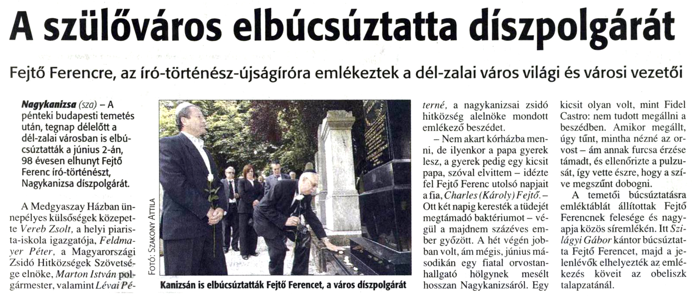 Nyilvános 1113 | 1444 | Zalai Hírlap 2008. június 16. 3. oldal | A szülőváros elbúcsúztatta díszpolgárát Fejtő Ferencre, az író-történész-újságíróra emlékeztek a dél-zalai város világi és városi vezetői Nagykanizsa (sza) - A pénteki budapesti temetés után, tegnap délelőtt a dél-zalai városban is elbúcsúztatták a június 2-án, 98 évesen elhunyt Fejtő Ferenc író-történészt, Nagykanizsa díszpolgárát. A Medgyaszay Házban ünnepélyes külsőségek közepette Vereb Zsolt, a helyi piarista-iskola igazgatója, Feldmayer Péter, a Magyarországi Zsidó Hitközségek Szövetsége elnöke, Marton István polgármester, valamint Lévai Pétérné, a nagykanizsai zsidó hitközség alelnöke mondott emlékező beszédet. - Nem akart kórházba menni, de ilyenkor a papa gyerek lesz, a gyerek pedig egy kicsit papa, szóval elvittem - idézte fel Fejtő Ferenc utolsó napjait a fia, Charles (Károly) Fejtő. - Ott két napig keresték a tüdejét megtámadó baktériumot - végül a majdnem százéves ember győzött. A hét végén jobban volt, ám mégis, június másodikén egy fiatal orvostanhallgató hölgynek mesélt hosszan Nagykanizsáról. Egy kicsit olyan volt, mint Fidel Castro: nem tudott megállni a beszédben. Amikor megállt, úgy tűnt, mintha nézné az orvost - ám annak furcsa érzése támadt, és ellenőrizte a pulzusát, így vette észre, hogy a szíve megszűnt dobogni. A temetői búcsúztatásra emléktáblát állítottak Fejtő Ferencnek felesége és nagyapja közös síremlékén. Itt Szilágyi Gábor kántor búcsúztatta Fejtő Ferencet, majd a jelenlévők elhelyezték az emlékezés köveit az obeliszk talapzatánál. Kanizsán is elbúcsúztatták Fejtő Ferencet, a város díszpolgárát |