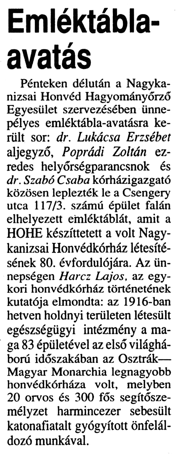 Nyilvános 1191 | 1855 | Zalai Hírlap 1996. november 23. 24. oldal | Emléktábla-avatás Pénteken délután a Nagykanizsai Honvéd Hagyományőrző Egyesület szervezésében ünnepélyes emléktábla-avatásra került sor: dr. Lukácsa Erzsébet aljegyző, Poprádi Zoltán ezredes helyőrségparancsnok és dr. Szabó Csaba kórházigazgató közösen leplezték le a Csengery utca 117/3. számú épület falán elhelyezett emléktáblát, amit a HOHE készíttetett a volt Nagykanizsai Honvédkórház létesítésének 80. évfordulójára. Az ünnepségen Harcz Lajos, az egykori honvédkórház történetének kutatója elmondta: az 1916-ban hetven holdnyi területen létesült egészségügyi intézmény a maga 83 épületével az első világháború időszakában az Osztrák-Magyar Monarchia legnagyobb honvédkórháza volt, melyben 20 orvos és 300 fős segítőszemélyzet harmincezer sebesült katonafiatalt gyógyított önfeláldozó munkával. |